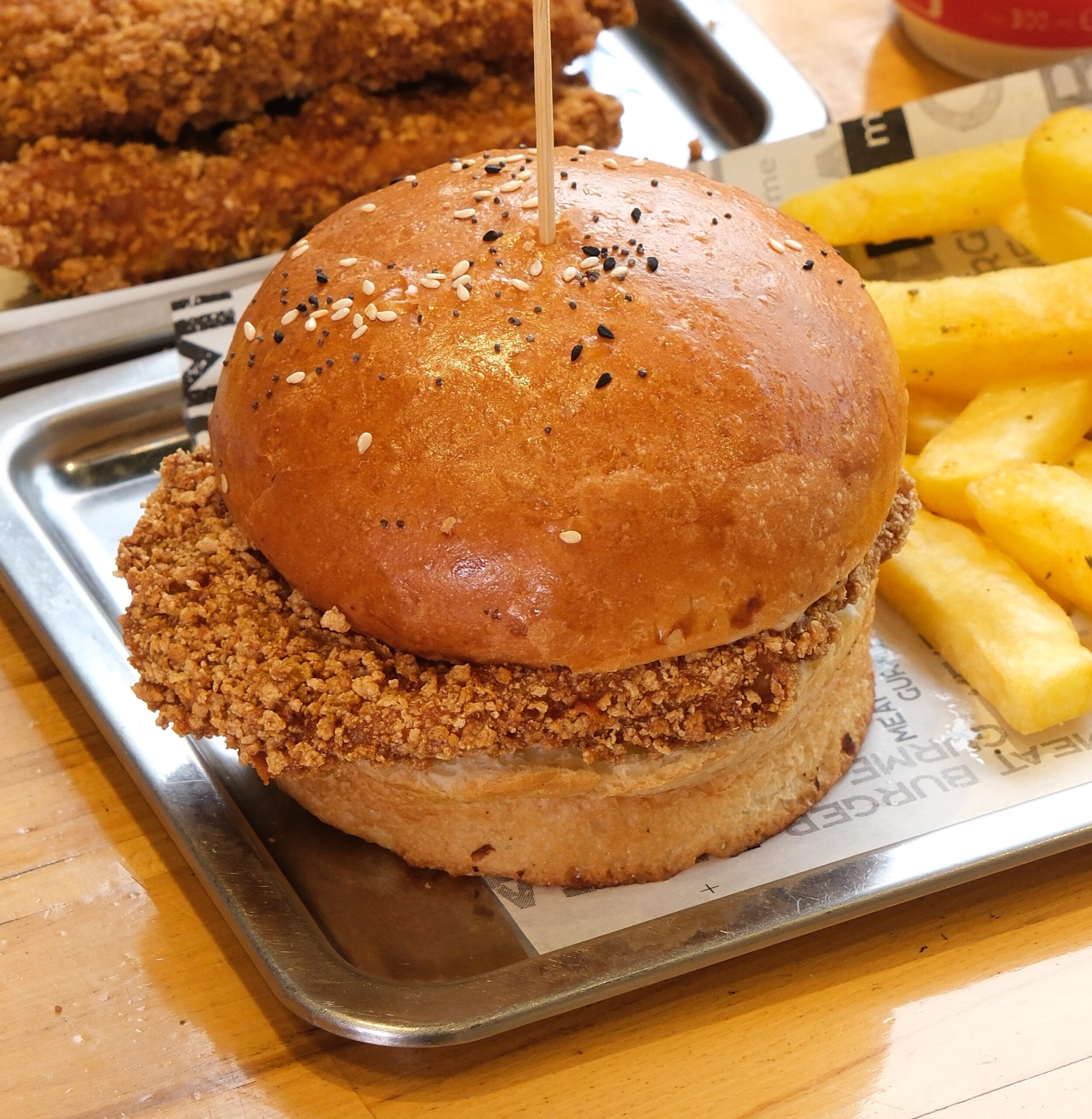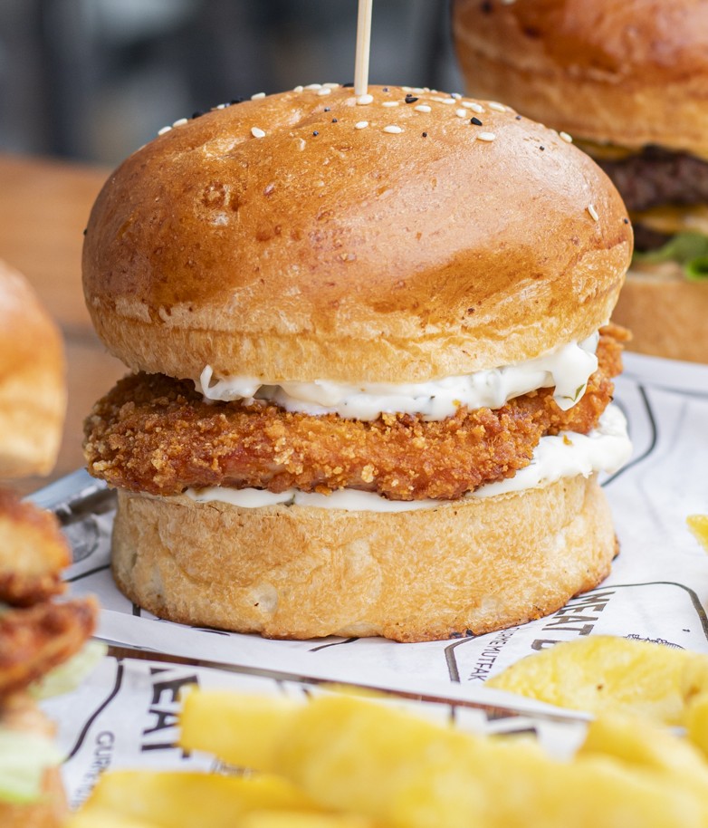 150 gr özel soslu izgara tavuk bonfile, cheddar peyniri, köz domates, köz biber, yeşillik, Meat Burger sos ve patates kızartması ile