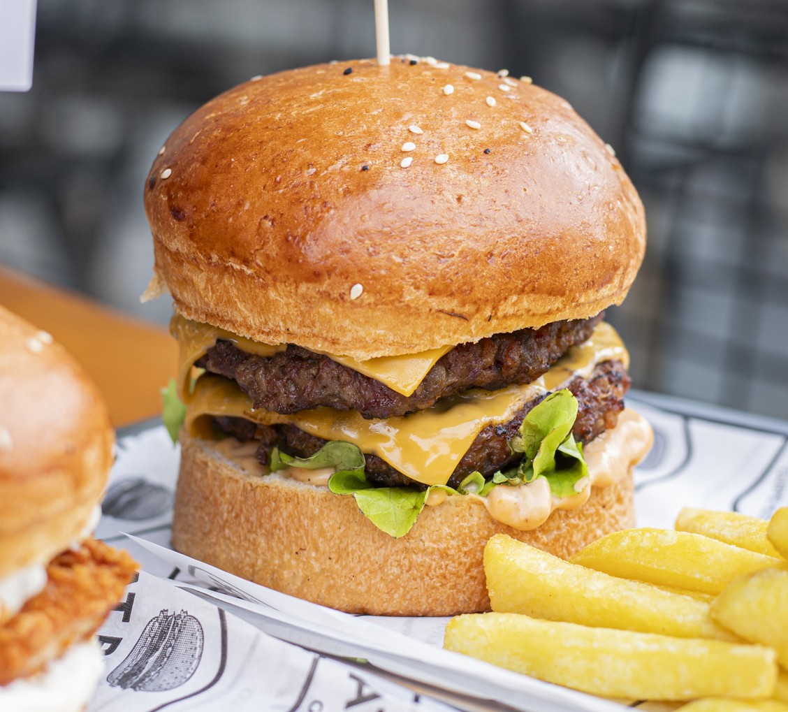 120 gr. dana köfte, duble cheddar peynir, yeşillik, domates, Meat Burger sos ve patates kızartması ile