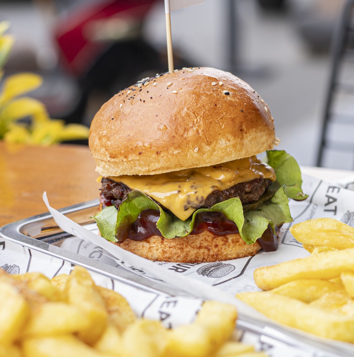 120 gr dana köfte, karamelize soğan, cheddar peyniri, turşu, yeşillik, barbekü sos ve patates kızartması ile